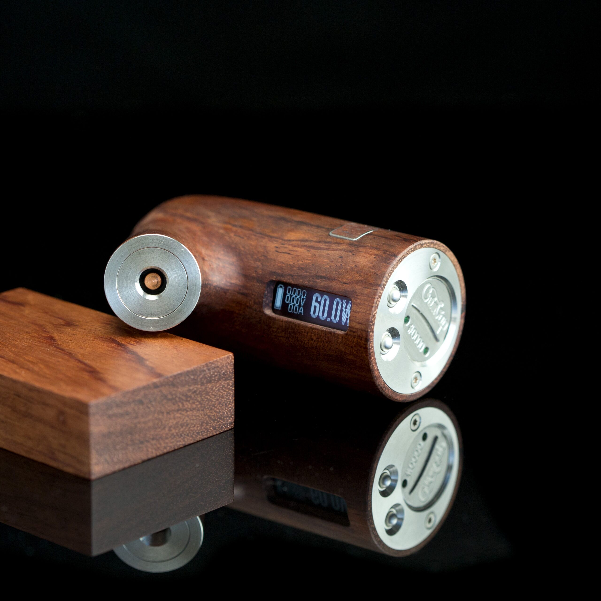 La Gandalf DNA 60 se distingue par sa fabrication à partir de matériaux durables en « bois de rose », « bois de noyer », « Wengé » ou « Zebrano ». Le revêtement intérieur de la E-pipe est en Delrin noir et le bouton switch en aluminium gravé porte le logo de la marque Créavap.