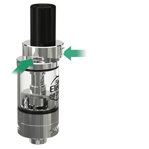 Ce clearomiseur possède un système de fermeture sécurisé par verrouillage. Pour remplir le réservoir, appuyer sur le bouton situé au « top » du réservoir tout en poussant vers le haut.
